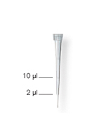 吸頭外形修長,長度46 mm,移液時不會觸碰到微量儲存管管壁或微孔板板壁。吸頭 于2 μl及10 μl處有刻度標記,便于快速檢查體積。預裝移液器吸頭無色透明,放置于一 個灰色的吸頭托架上。